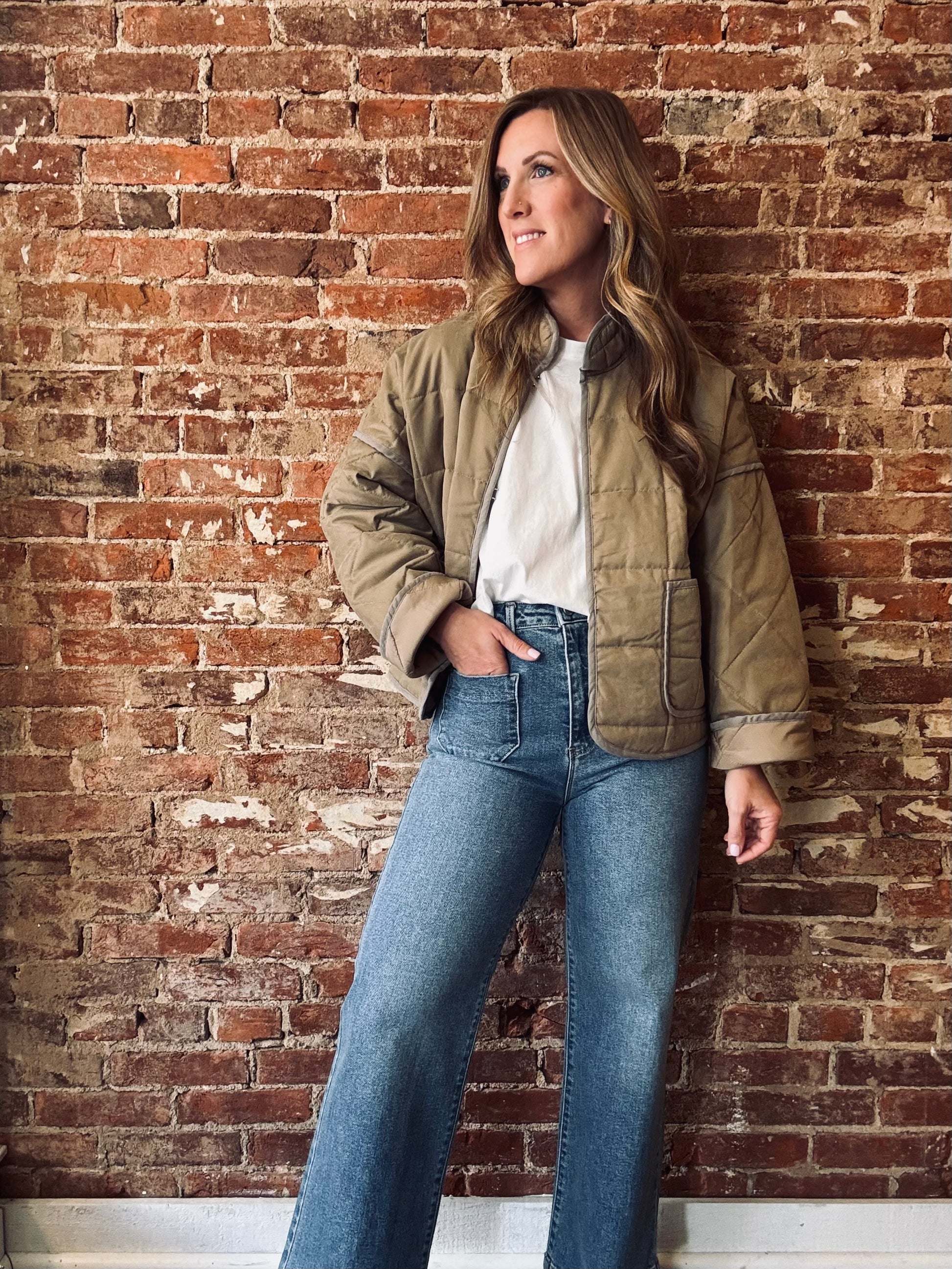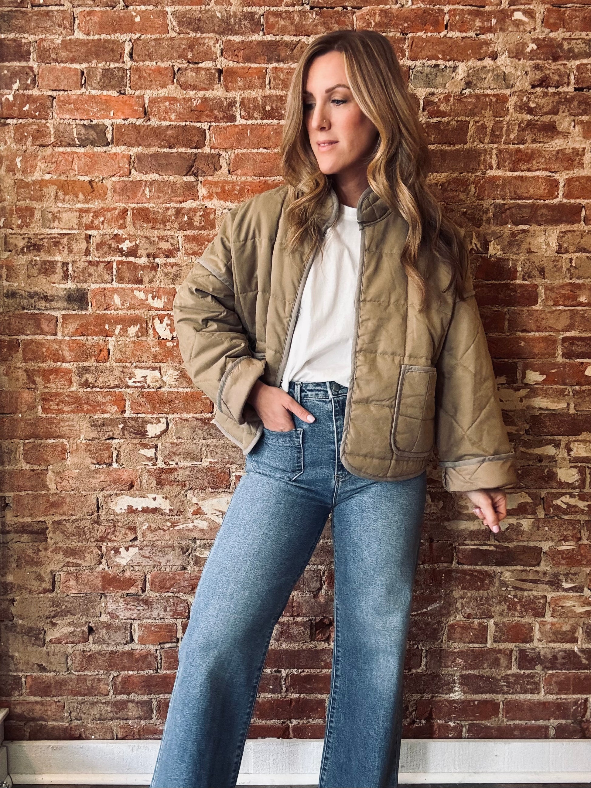 Fall and winter are right around the corner, but don't worry, the Hattie Quilted Jacket has you covered! This boxy crop coat in a beautiful muted brownish green color is the perfect layer for chilly days. Stay warm and stylish all season long with this must-have addition to your wardrobe.