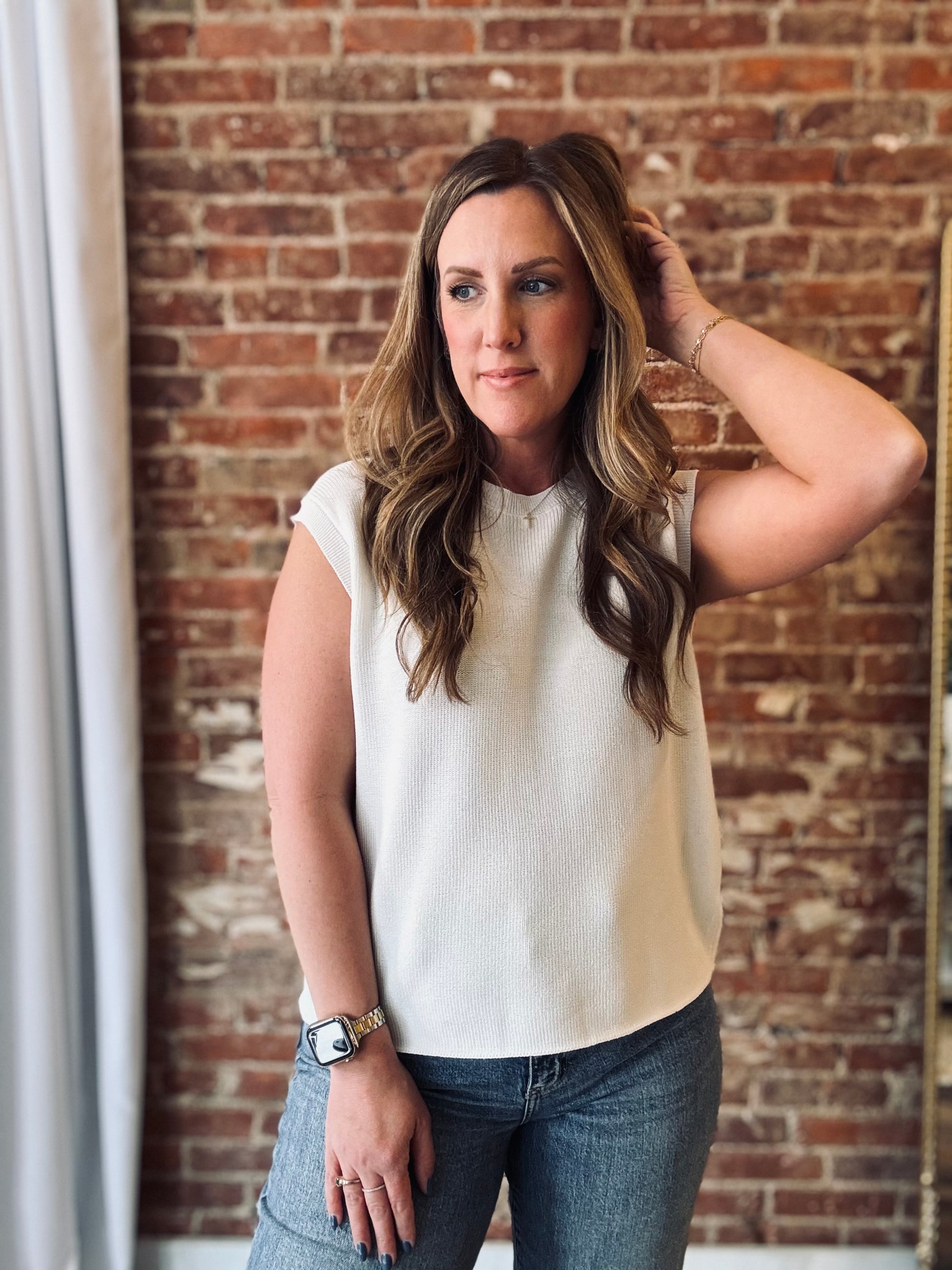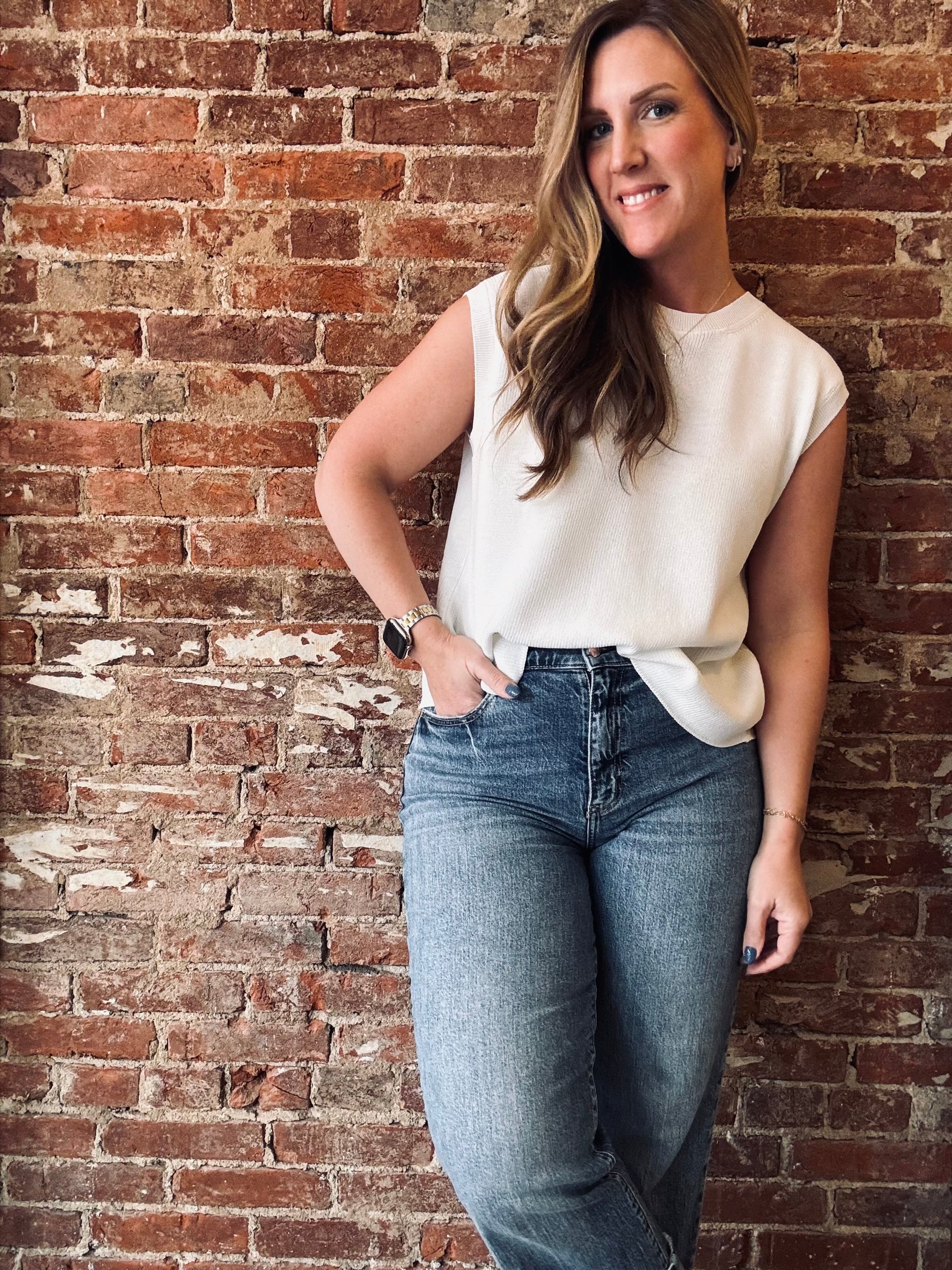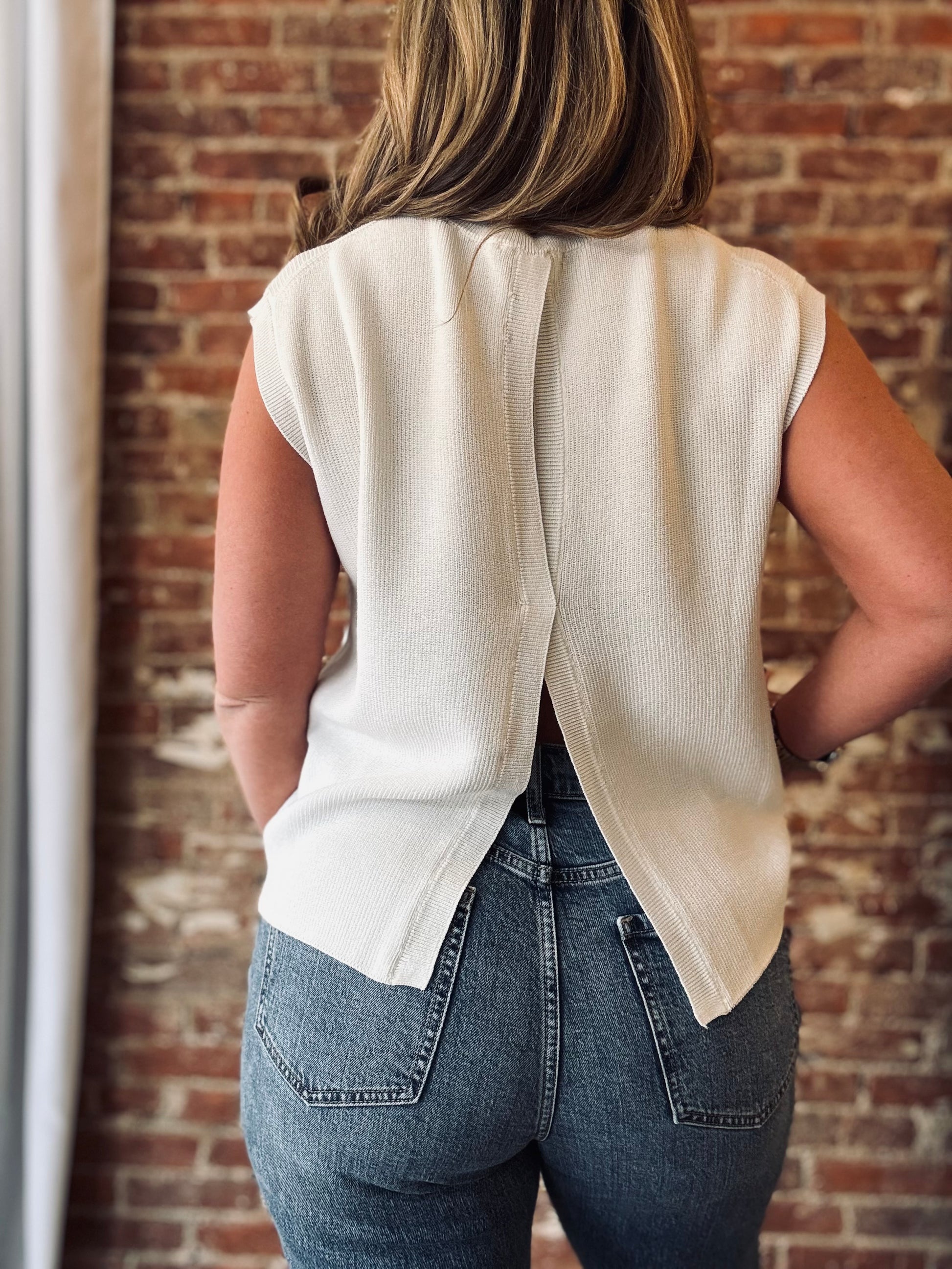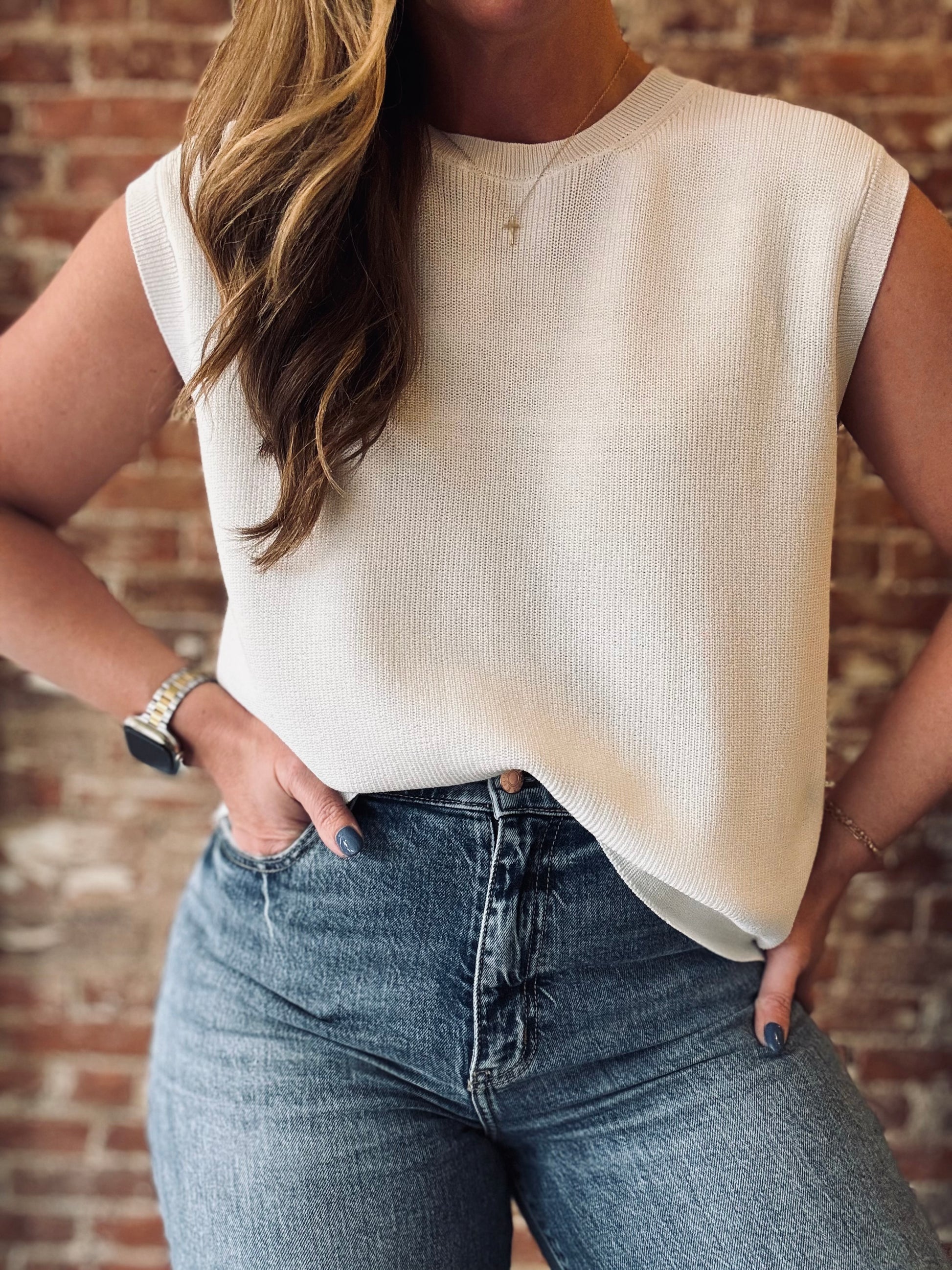 Introducing the Haven Knit Top - a white sweater tank designed to elevate your everyday look. With a key hole detail on the back and a comfortable yet chic boxy fit, this top is more than just your average piece. Dress it up or down for effortless style and comfort.