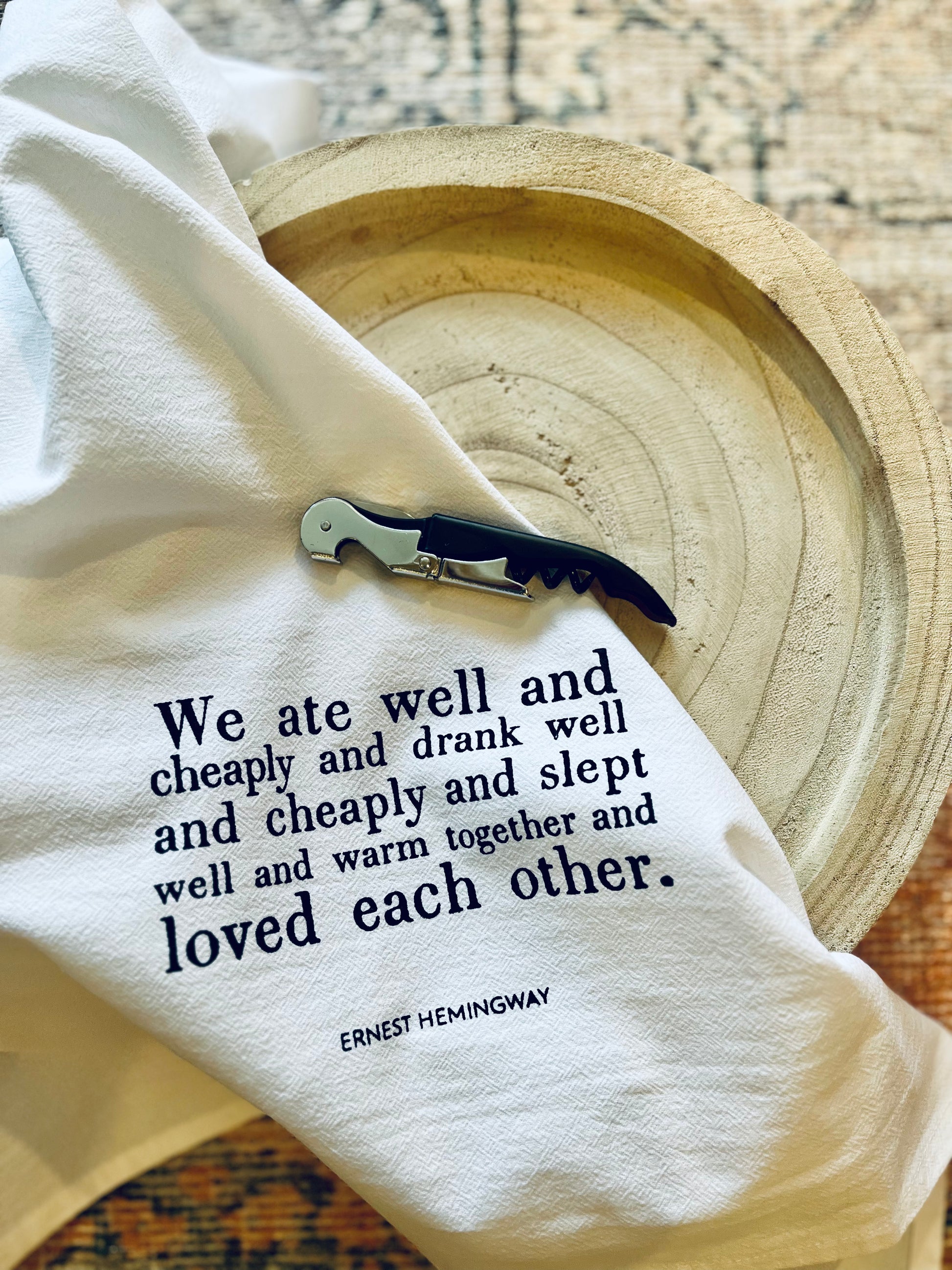 Unwrap Ernest Hemingway's timeless wisdom with our charming tea towel! Perfect for kitchens, this classic quote will both amuse and inspire.